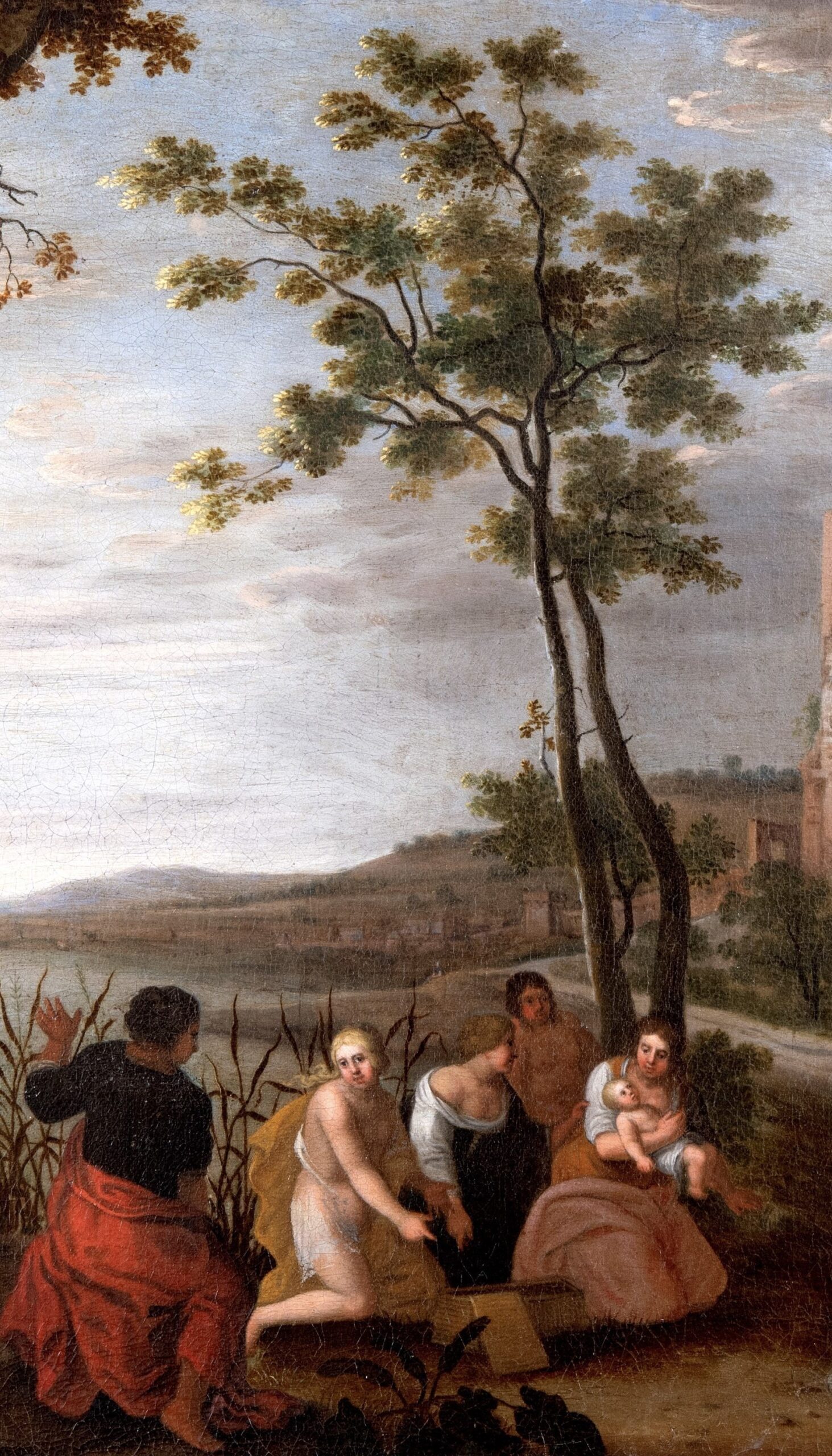 All the key elements of the story are to be found in our painting: on the right Pharaoh’s daughter, finely dressed, bejewelled and shielded from the sun by an umbrella held by a manservant; to the left, her maidservants, modestly dressed and full of surprise at what they have found, one of them cradling an infant, who looks up at her with a flushed face (an indication of his weeping as described in Exodus). On the ground we see the “ark of bulrushes” fashioned by Moses’ mother. Here the artist has taken license in painting what looks like an elaborate woven basket, with multiple flaps: more what a 17th Century Dutch Lady would have for a picnic than something woven by hand 3000 years before.