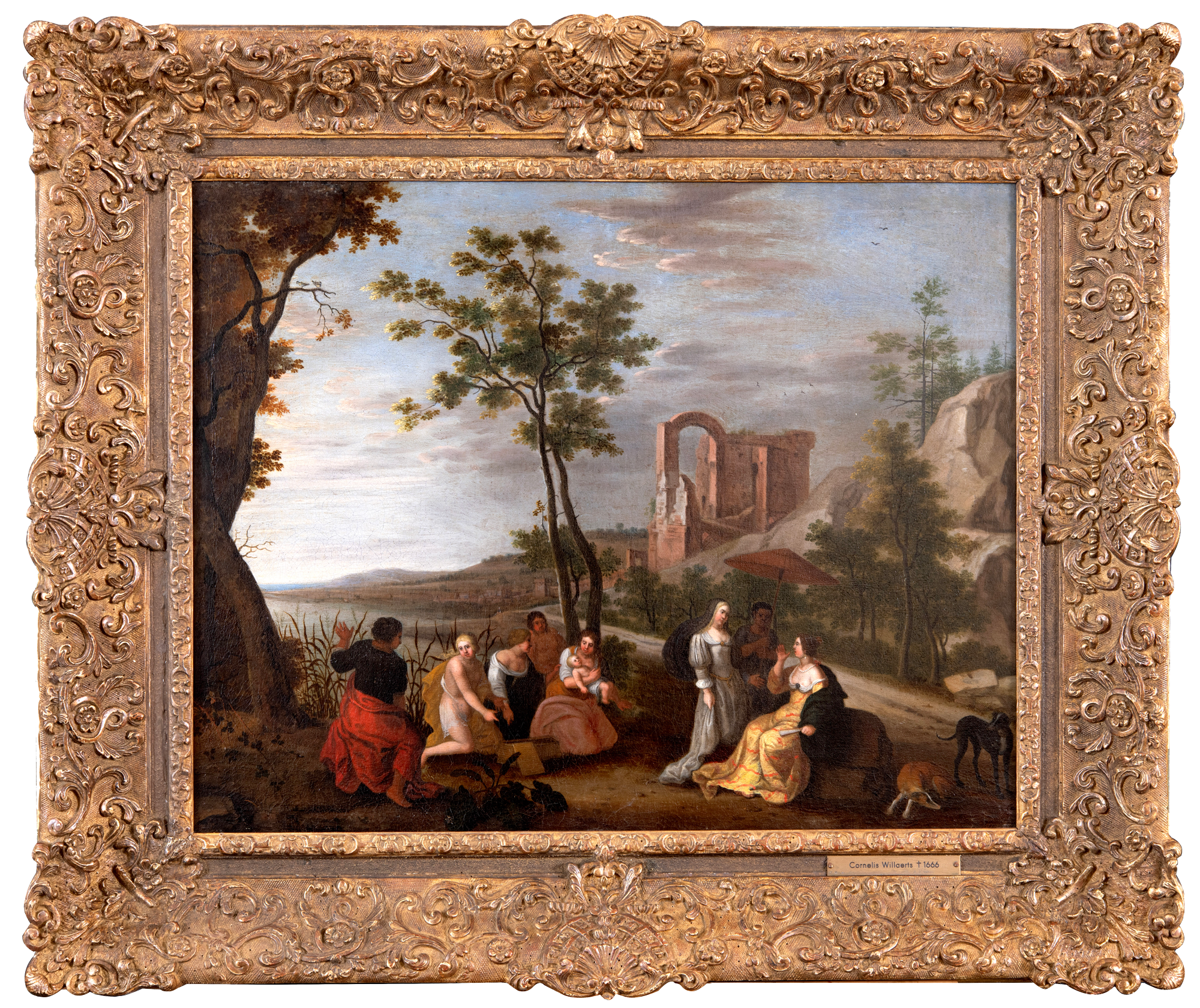 Our signed painting is by Dutch Golden Age painter Cornelis Adamsz. Willaerts (1600-1666), who was almost an exact contemporary of Rembrandt (1606 – 1669). Willaerts was known for his paintings of biblical and mythological subjects; a drawing of his is in the collection of the National Gallery in Washington, DC. Our Willaerts is set within an ornamental frame fitting for the majesty of the origin story of Moses.