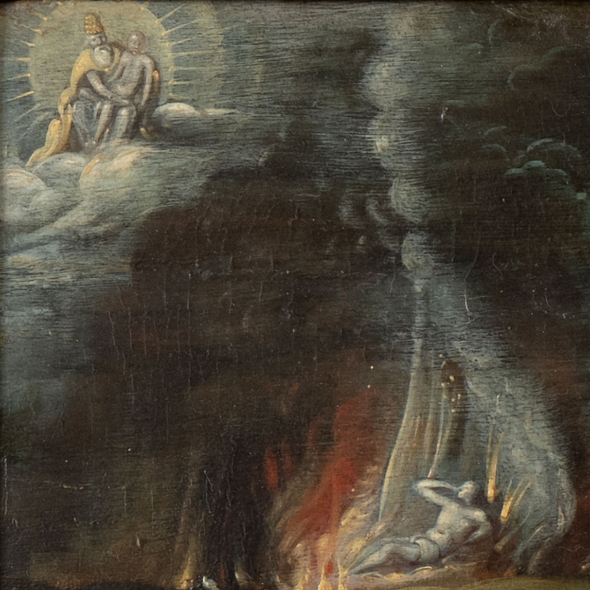 As the parable tells, Lazarus and the Rich Man later both die. In the upper left of our painting, we see the reversal of fortunes: Lazarus is in heaven, in the arms of Father Abraham, and the Rich Man is in hell. Luke tells of the Rich Man begging Abraham to send Lazarus “that he may dip the tip of his finger in water, and cool my tongue; for I am tormented in this flame.” Abraham refuses, saying “remember that thou in thy lifetime receivedst thy good things, and likewise Lazarus evil things: but now he is comforted, and thou art tormented.”